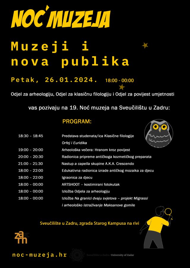 Odjel za arheologiju Sveučilišta u Zadru u suradnji s Odjelom za klasičnu filologiju i Odjelom za povijest umjetnosti poziva Vas da nam se pridružite u još jednoj Noći muzeja. Ovogodišnja, 19. po redu manifestacija održati će se u petak, 26. siječnja 2024. godine s početkom u 18 sati u izložbenom prostoru Odjela za arheologiju u zgradi Starog kampusa na rivi (Obala Petra Krešimira IV, 2).