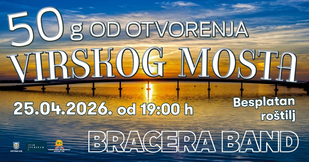 Sutra u subotu 25. travnja na virskoj rivi obilježit će se 50 godina od svečanog puštanja u promet Virskog mosta (25. travnja 1976.), a u 19 sati na rasporedu je besplatan roštilj sa čašom vina te koncert Bracera Banda iz Vodica od 20 sati.