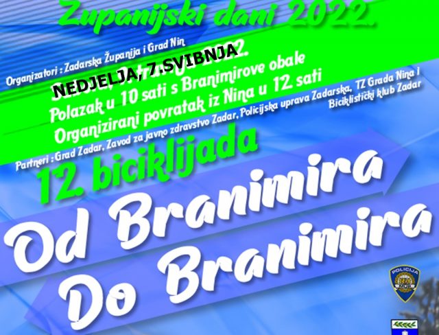 12. biciklijada „Od Branimira do Branimira“ Zadar-Nin-Zadar, održat će se 7. svibnja 2022. godine (subota) u trajanju od 10,00 do 14,00 sati .