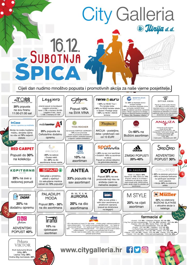 Božić nam se bliži, a vi sigurno još užurbano tražite one savršene male darove za vaše najdraže. Svratite zato ovu subotu, 16. prosinca do centra City Galleria i provjerite odličnu ponudu trgovina centra uz posljednju ovogodišnju „SUBOTNJU ŠPICU“ sa brojnim popustima i blagdanskim akcijama.
