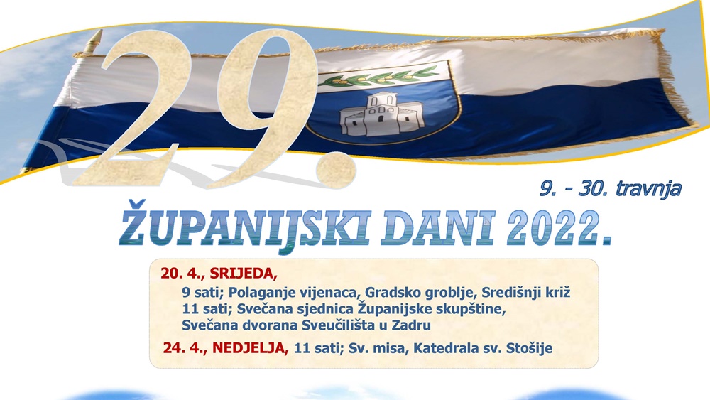 Biciklijadom “Od Branimira do Branimira”, akcijom pješačenja “1000 koraka kroz 1000 ulica” , ekološkom akcijom Daj ruku za čistu Puntu Bajlo , Županijskim prvenstvom Zadarske županije u mažoret plesu te izložbom fotografija Tomislava Marijana Bilosnića Ljepote i znamenitosti Zadarske županije počinju ovogodišnji Županijski dani. Tijekom travnja održat će se više sportskih i kulturnih manifestacija, a središnji događaj je Svečana sjednica Županijske skupštine 20. travnja 2022. na kojoj će biti dodijeljene nagrade i priznanja ovogodišnjim laureatima.