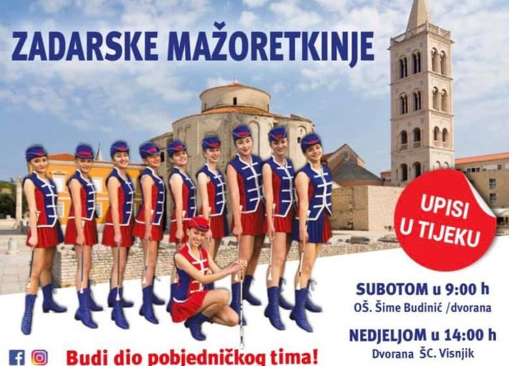 Zadarske Mažoretkinje u subotu 6.ožujka u 09.00 sati u OŠ Šime Budinića te u nedjelju 7.ožujka u 14.00 sati u ŠC Višnjik održavaju upise za nove članice. Voditeljica mažoretkinja Željka Vitlov istaknula je kako na upise mogu doći curice i cure od 4 do 25 godina koje će biti raspoređene u nekoliko grupa ovisno o dobi.