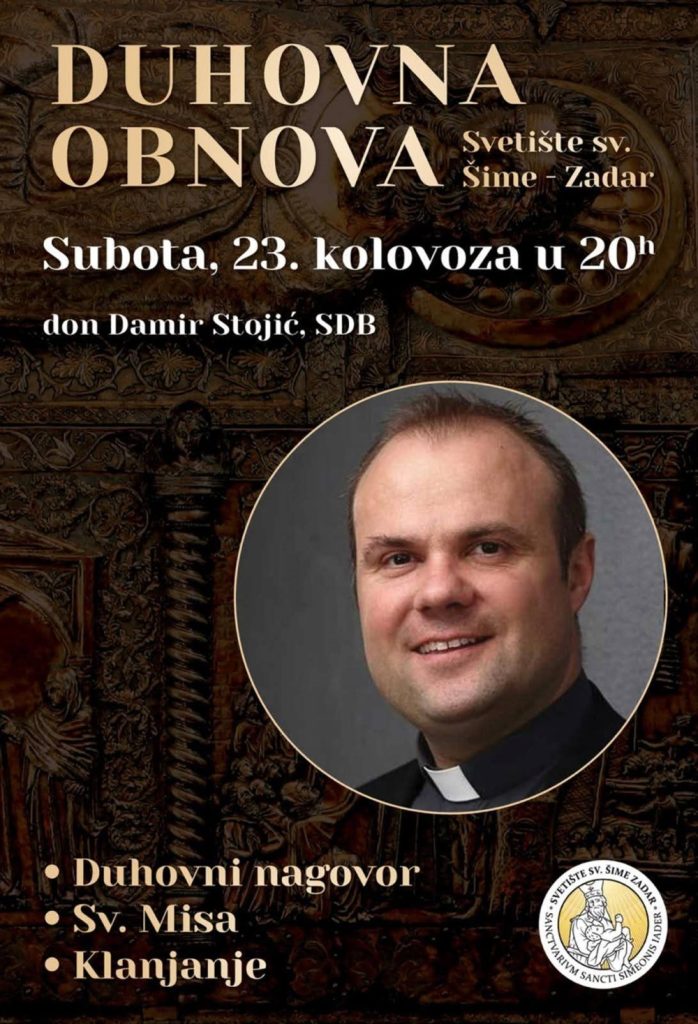 U subotu, 23. kolovoza, duhovnu obnovu u crkvi sv. Šime u Zadru s početkom u 20 sati predvodi don Damir Stojić. Don Damir će održati prigodni nagovor, predvoditi misno slavlje i klanjanje nakon mise.
