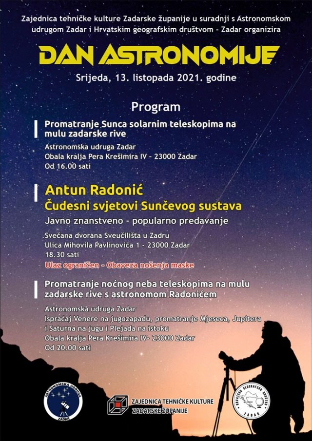 Dan astronomije obilježit će se u srijedu, 13. listopada. Tim povodom Zajednica tehničke kulture Zadarske županije u suradnji s Astronomskom udrugom Zadar i Hrvatskim geografskim društvom – Zadar organizira zanimljiv program.