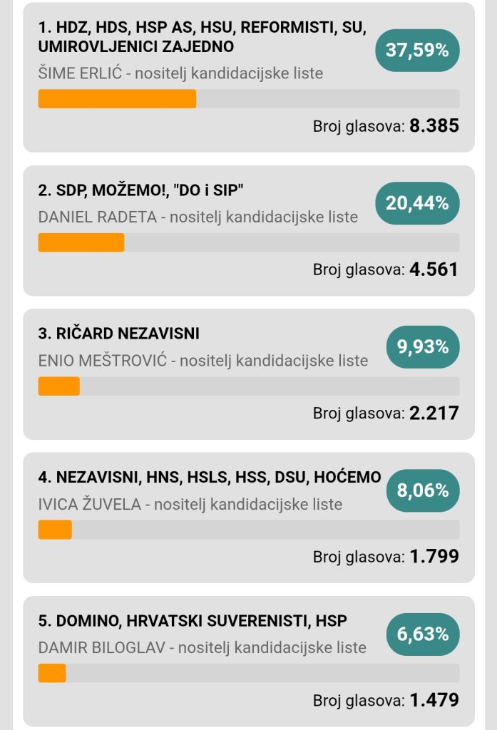 Kandidat HDZ-a i partnera za zadarskog gradonačelnika Šime Erlić osvojio je 40,84% glasova i u drugom krugu ide u borbu protiv kandidata SDP-a i partnera Danijela Radete koji je osvojio 21,17% glasova birača.