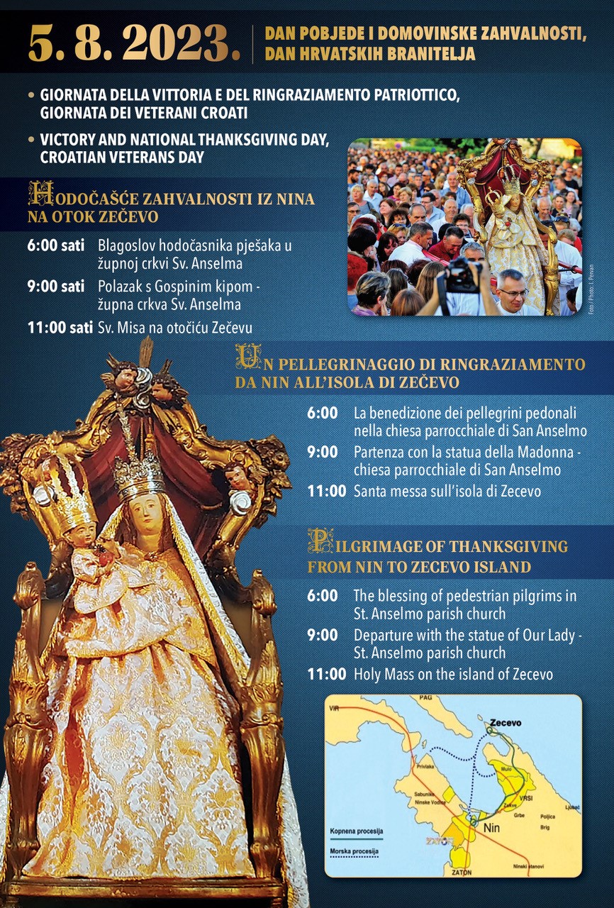 Tradicionalno na Dan pobjede i domovinske zahvalnosti i Dana hrvatskih branitelja 05. 08. 2023. hodočasti se iz Nina na otok Zečevo.