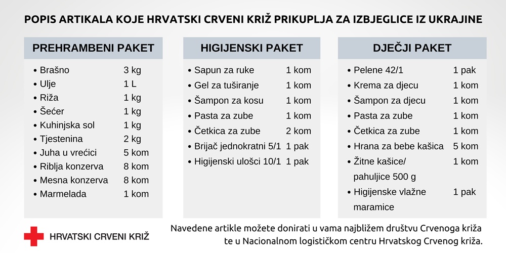 Popis artikala rezultat je dogovora s Crvenim križevima iz Ukrajine i okolnih zemalja. Naime, tim Hrvatskog Crvenog križa koji je protekli vikend boravio u Ukrajini, provjerio je stanje izravno na terenu kako bi se uvjerio što je točno potrebno ljudima izbjeglima iz Ukrajine, kao i najbolji način za dostavu pomoći. U skladu s tim, ali i iskustvom rada s izbjeglicama koje su zaštitu potražile u Hrvatskoj, kreiran je popis potrebnih proizvoda i Hrvatski Crveni križ trenutno neće prikupljati ništa osim navedenoga.