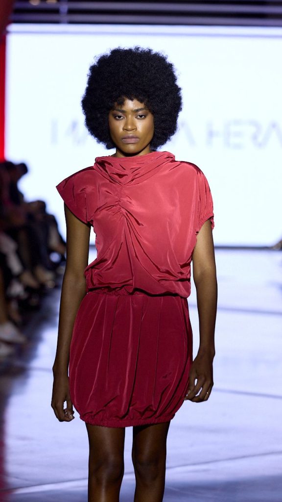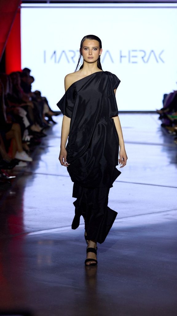 Martina Herak ponovno pomiče granice očekivanog sa svojim najnovijom kolekcijom, donoseći snažan vizualni i emotivni izraz u kojem se snaga komunicira kroz kroj, boju i stav. Senzualnost se otkriva na suptilan, promišljen način – svaki prorez pažljivo je pozicioniran kako bi naglasio siluetu i pokret, dok asimetrične linije unose arhitektonsku dimenziju u dizajn. Materijali dodatno pojačavaju kontrast i igru tekstura: prirodne tkanine prate tijelo u pokretu, sjajni taft dodaje dozu dramatičnosti i strukture, a transparentna mreža s reljefnim detaljima unosi element suptilne provokacije. Kolekcija odiše suvremenom ženstvenošću koja osvaja pažnju snagom tišine.