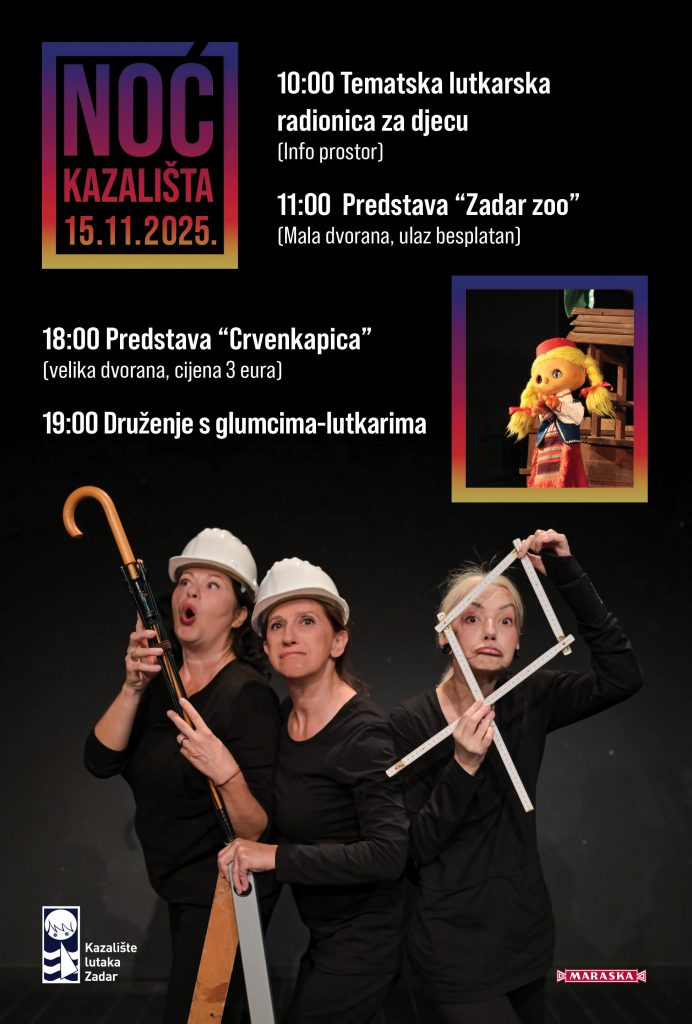 Kazalište lutaka Zadar s veseljem najavljuje još jednu Noć kazališta, 15. studenog 2025., međunarodnu manifestaciju koja svake godine ujedinjuje kazališta diljem Europe u slavlju izvedbenih umjetnosti.