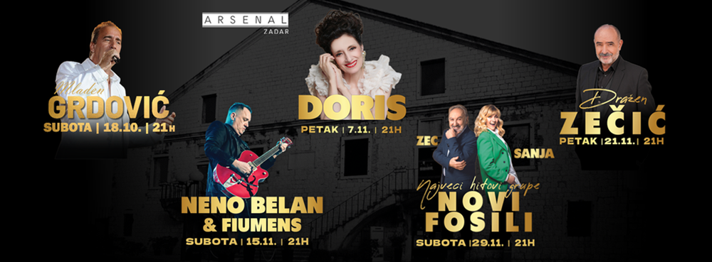 Mjesec studeni u Arsenal donosi četiri izvrsna koncerta. 7. Studenoga na pozornicu se penje Doris Dragović koja uvijek nosi posebnu energiju i emociju. Zatim, 15. studenoga, stiže legendarni Neno Belan. Njegove pjesme vratit će nas u ’80.-te svojim mediteranskim šarmom, opuštenom zafrkancijom i romantičnim hitovima koji bude sjećanja na stare ljubavi.