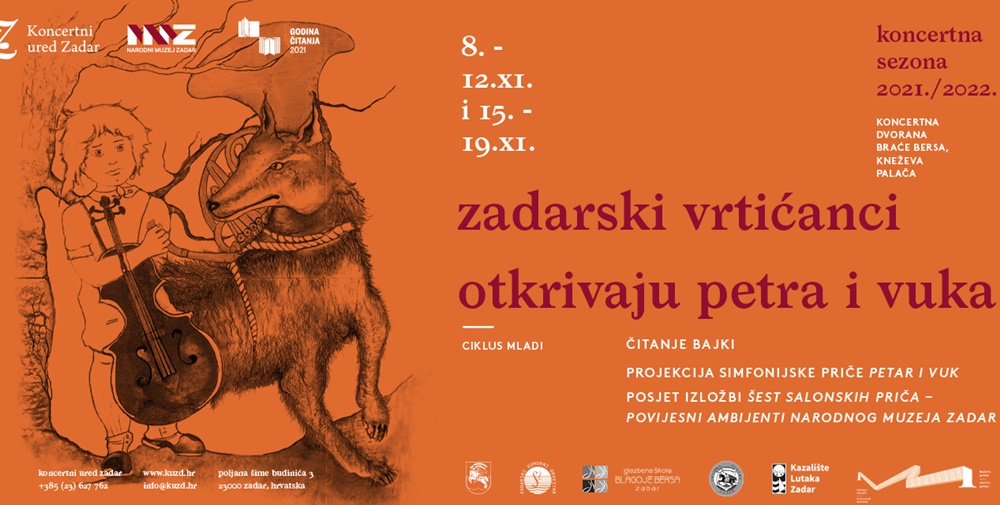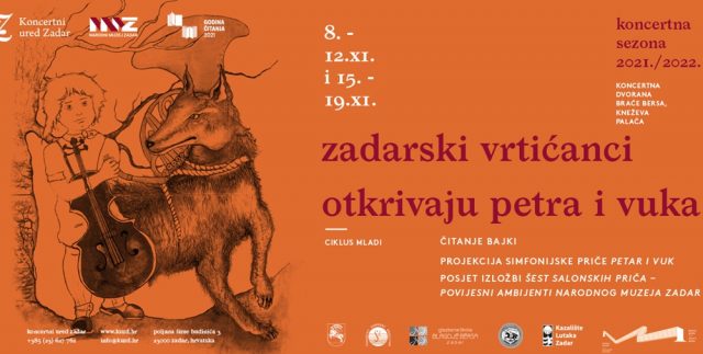 Zadarski vrtićanci otkrivaju Petra i vuka projekt je iznikao iz suradnje Koncertnog ureda Zadar sa Zadarskim komornim orkestrom, gdje se tri godine zaredom (2018., 2019. i 2020.) priređivala izvedba orkestralne suite Petar i vuk Sergeja Prokofjeva koja je postala simbol glazbenoga kazališta za djecu i mlade. Kako se ove godine iz epidemioloških razloga nije mogla realizirati živa izvedba s orkestrom pred 600 djece u velikoj dvorani HNK Zadar, tijekom studenog organizirala se projekcija u Koncertnoj dvorani braće Bersa u Kneževoj palači, pred malim grupama od dvadesetak djece.