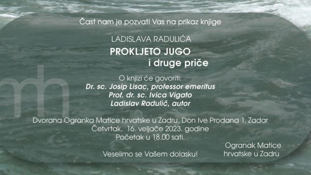 Ogranak Matice hrvatske u Zadru predstavlja knjiga Ladislava Radulića: “Prokljeto jugo i druge priče”.