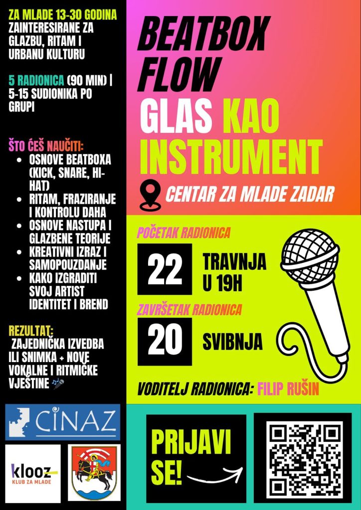 Uz to, započela je i beatbox radionica koju vodi Filip Rušin u organizaciji Udruge CINAZ. Program, namijenjen mladima od 13 do 30 godina, uključuje pet radionica kroz koje će sudionici razvijati vokalne i ritmičke vještine te istraživati beatbox kao umjetnički izraz. Radionice traju do 20. svibnja, a više informacija o svim aktivnostima dostupno je na službenim stranicama Centra za mlade.