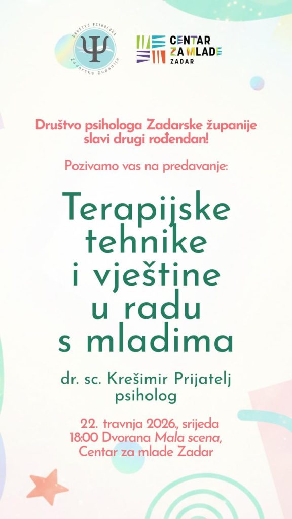 Zanimljivo predavanje održalo je i Društvo psihologa Zadarske županije. Psiholog Krešimir Prijatelj govorio je o terapijskim tehnikama i radu s mladima, s naglaskom na razumijevanje njihovih potreba i razvoj učinkovitih oblika podrške. Predsjednica društva Tajana Nimković naglasila je kako je predavanje bilo namijenjeno psiholozima i stručnjacima pomagačkih profesija ali i otvoreno za javnost.