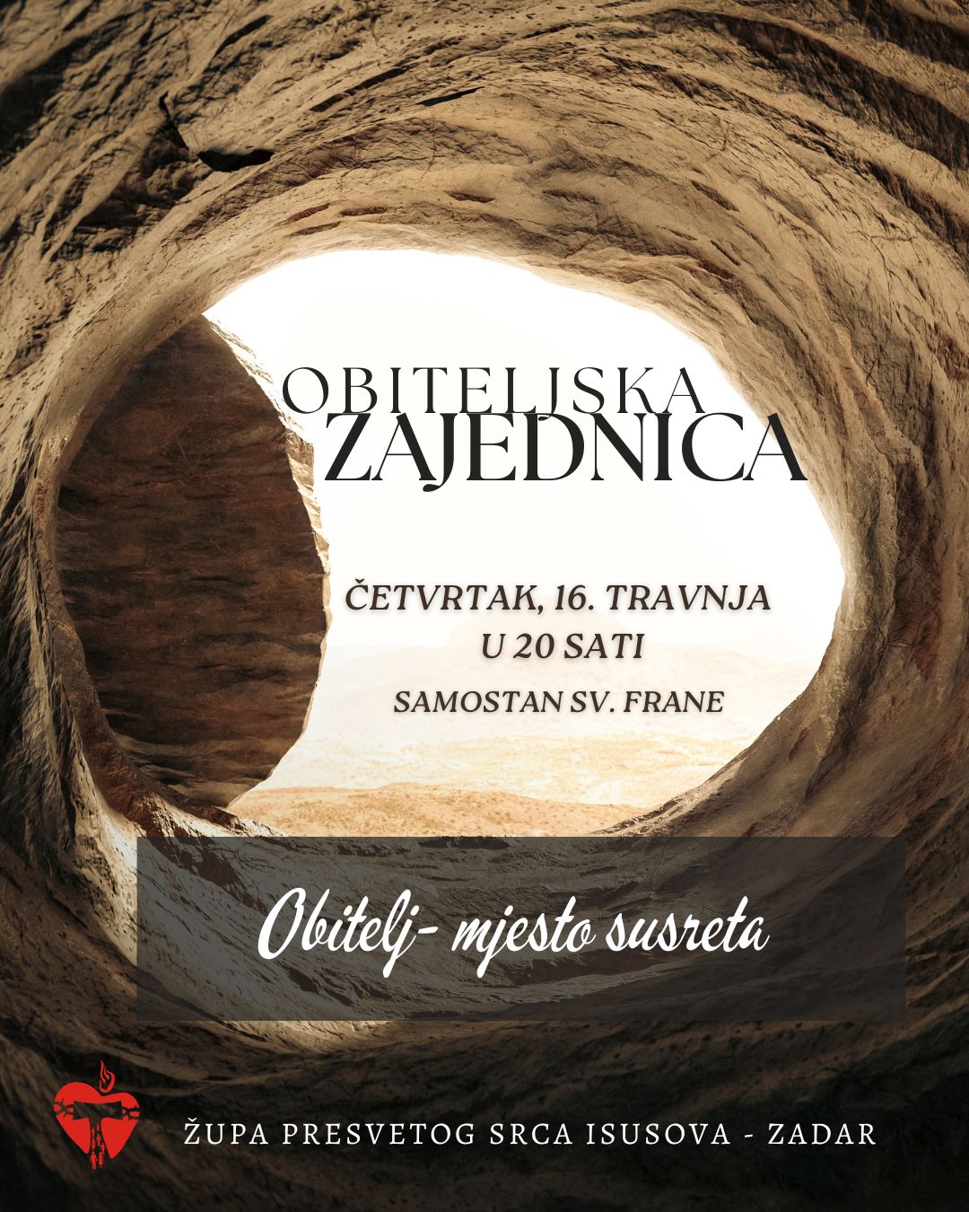 Župi Presvetog Srca Isusova u Zadru i ovoga tjedna nastavlja s inicijativom okupljanja obitelji kroz susrete pod nazivom „Obiteljska zajednica”. Novi susret održat će se večeras s početkom u 20 sati u Samostanu sv. Frane. U samostanu su čak organizirali i čuvanje djece dok susret traje.