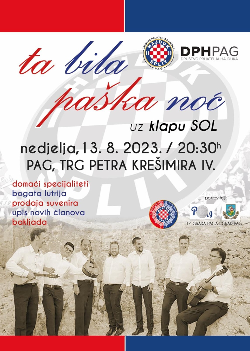 U nedjelju, 13. kolovoza, već tradicionalno, u organizaciji Društva prijatelja Hajduka na glavnom gradskom trgu u Pagu održat će se Bila noć.