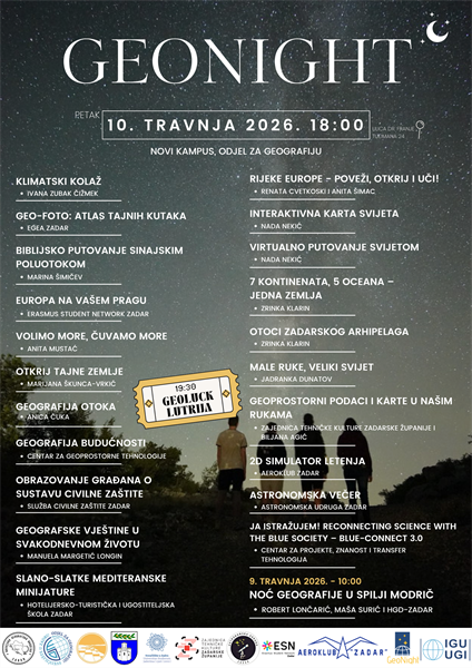Članovi Hrvatskog geografskog društva – Zadar, u suradnji s učiteljima i nastavnicima osnovnih i srednjih škola, Odjela za geografiju i Odjela za ekologiju, agronomiju i akvakulturu Sveučilišta u Zadru, Centrom za projekte, znanost i transfer tehnologija, članovima Aerokluba Zadar, Astronomske udruge Zadar, EGEA-e Zadar, European Student network – Zadar, Službom civilne zaštite Zadar i Zajednicom tehničke kulture Zadarske županije, zajednički će obilježiti Noć geografije (GeoNight) koja će se održati u petak 10. travnja 2026. na Novom kampusu Sveučilišta u Zadru. Ove godine planirano je oko 300 aktivnosti širom svijeta. Noć geografije organizira EUGEO (European Geographical Organisation) u suradnji s geografskim društvima država Europe.
