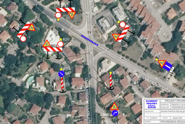 Obavještavaju se vozači u cestovnom prometu da će zbog izvođenja radova društva VODOINSTALACIJA d.o.o.  iz Zadra na izgradnji glavnog kolektora visoke zone u raskrižju ulica Denisa Špike, Miroslava Krleže, Put Petrića i Ivana Gundulića u Zadru, od dana 27. travnja 2026.g. (ponedjeljak) na snazi biti privremena regulacija prometa. Predviđeno trajanje radova je do 1. lipnja.