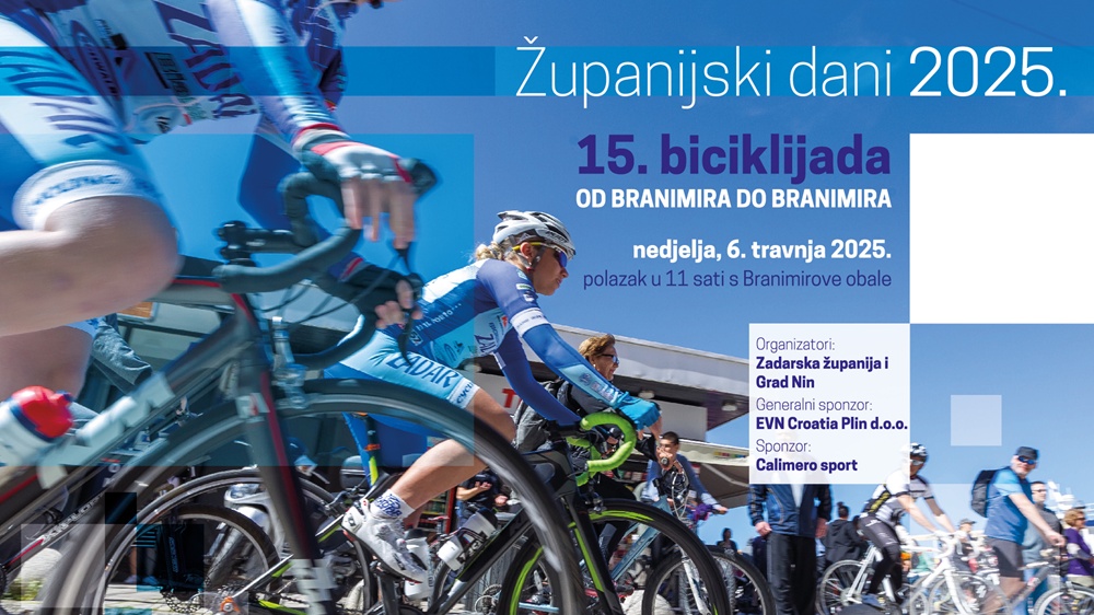 15. biciklijada „Od Branimira do Branimira“ Zadar-Nin, održat će se u nedjelju, 6. travnja 2025. godine u trajanju od 11,00 do 13,00 sati . Biciklijada koja spaja Branimirovu obalu u Zadru s Branimirovom obalom u Ninu okupit će još jednom profesionalce i amatere, ali i turiste koji se u to vrijeme zateknu u Zadru. Organizatori ove manifestacije su Zadarska županija i Grad Nin, a partneri su PU zadarska, Zavod za javno zdravstvo Zadar, Biciklistički klub Zadar, TZ Grada Nina i HAK.