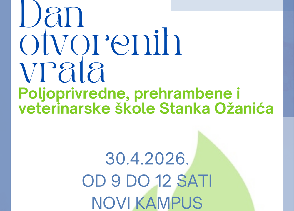 Poljoprivredna, prehrambena i veterinarska škola Stanka Ožanića poziva učenike, profesore, roditelje i sve zainteresirane da dođu u školu na na Dan otvorenih vrata, u četvrtak, 30. travnja 2026., u terminu od 9 do 12 sati, na adresi ulica dr. F. Tuđmana 24/H (Novi kampus).