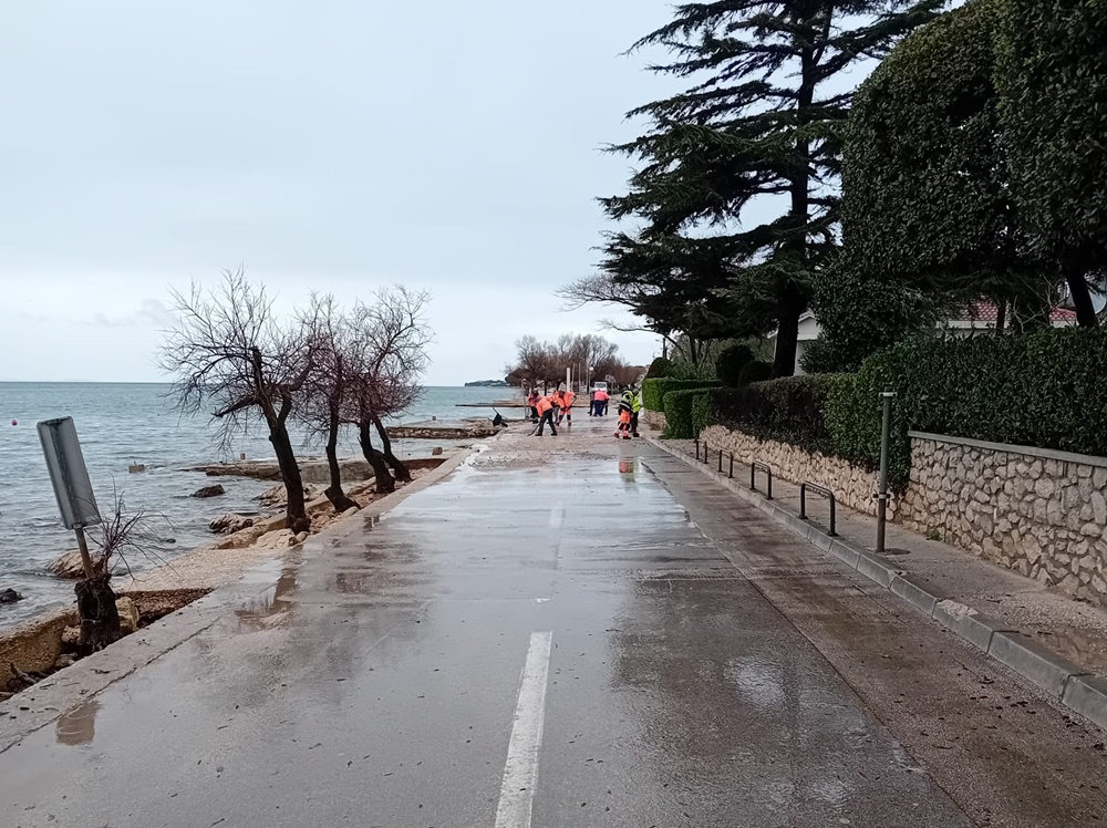 Uslijed snažnog juga more je na pojedinim lokacijama nanijelo šljunak na pješačke staze i prometnice, pa je tijekom noći zatvorena za sav promet Trpimirova obala, a cestovne ophodnje krenule su noćas s čišćenjem prometnica vraćanjem izbijenih šahtova i uklanjanjem naplavljenih predmeta kako bi održali razinu prometne sigurnosti. Sve prometnice su sada prohodne.