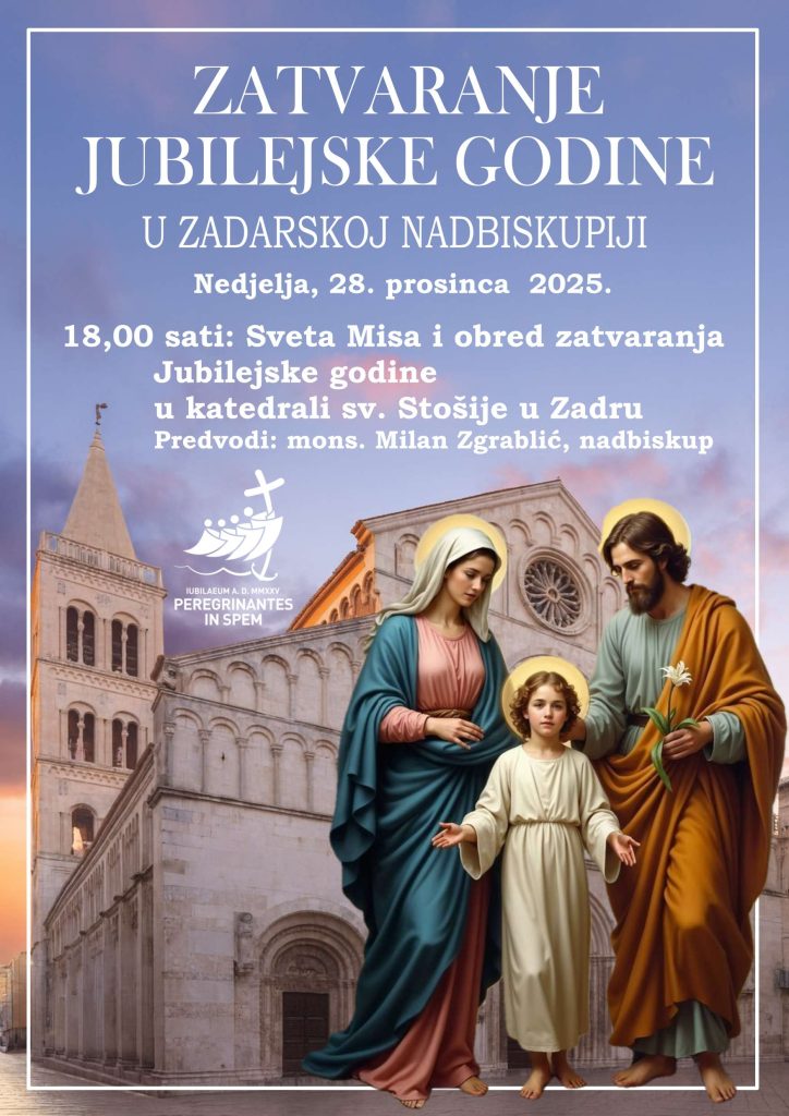 Svečani obred zatvaranja Jubilejske godine u mjesnoj Crkvi slavit ćemo za vrijeme svete Mise na svetkovinu Svete Obitelji lsusa, Marije i Josipa, u nedjelju, 28. prosinca 2025., s početkom u 18,00 sati, u katedrali sv. Stošije u Zadru. Srdačno vas pozivam na ovo euharistijsko slavlje, zajedno s vjernicima koji su vam povjereni.