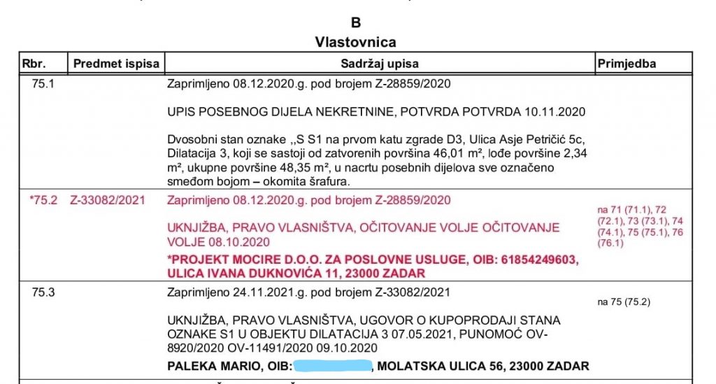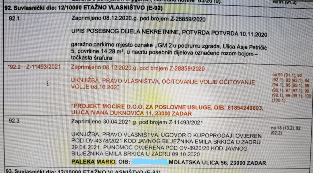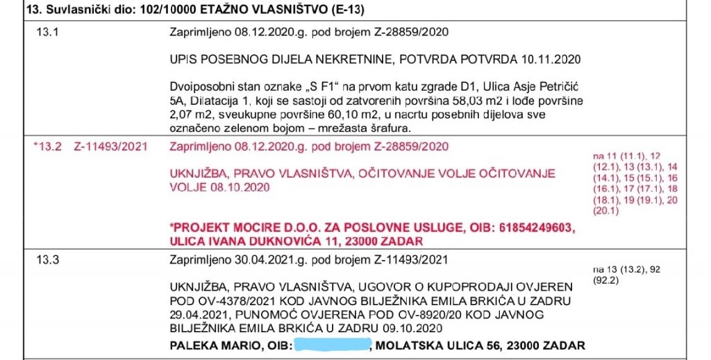 Mario Paleka navodi kako je naslijedio stan od roditelja i tetke ja evo uz ovo obraćanje javnosti prilažem dokaze da je Mario Paleka u novoj zgradi na adresi Asje Petričić 5A i 5C kupio dva stana i garažu direktno od tvrtke Projekt Mocire d.o.o. Ti stanovi i garaža nisu bili prethodno vlasništvo niti njegovih roditelja niti njegove tetke. Ukoliko je on naslijedio još neke stanove od roditelja i tetke neka dostavi javnosti dokumentaciju kao što je obećao novinaru. Pa da vidimo da li se kod tih stanova za koje ja nemam saznanja radi o stvarnom nasljedstvu ili kupovini preko roditelja i tetke ? Spomenuti BMW je model BMW 520 d, noviji model čiji osnovni tip košta 66 000 eura. Budući je Paleka ljubitelj skupih detalja ne sumnjam da je BMW napucan dodatnom opremom te da mu je cijena znatno veća od osnovne.