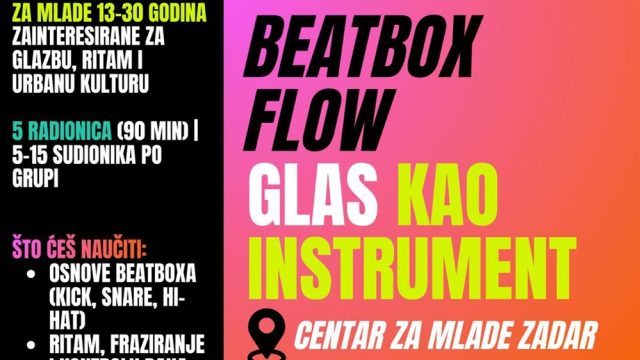 Radionica „Beatbox Flow“ osmišljena je kao edukativno-kreativni program namijenjen mladima u dobi od 13 do 30 godina koji pokazuju interes za glazbu, ritam, vokalni izraz i urbanu kulturu. Program okuplja manju grupu polaznika, čime se osigurava kvalitetan i individualiziran pristup radu.
