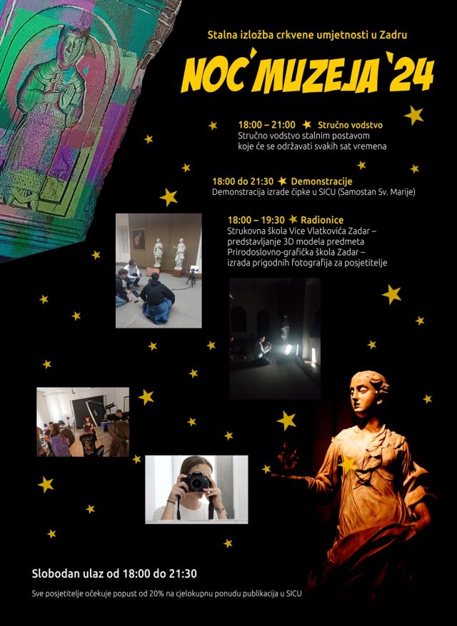 Devetnaesta Noć muzeja, koja će se ove godine održati u petak 26. siječnja, predstavlja se s temom MUZEJI I NOVA PUBLIKA! I ove godine Stalna izložba crkvene umjetnosti u Zadru sudjelovat će u ovoj važnoj kulturnoj manifestaciji, a priredili smo bogat i edukativan program koji će trajati od 18 do 21, 30 sati. Posjetitelje očekuju raznovrsni sadržaji namijenjeni svim dobnim skupinama. Ponosni smo da u programu ovogodišnje Noći muzeja sudjeluje veći broj učenika srednjoškolskog uzrasta, koji su istražujući povijest i vrijednost umjetničkih eksponata u našem postavu razvili vlastite ideje i kreativne spoznaje te tako uvelike doprinijeli realizaciji samog programa.