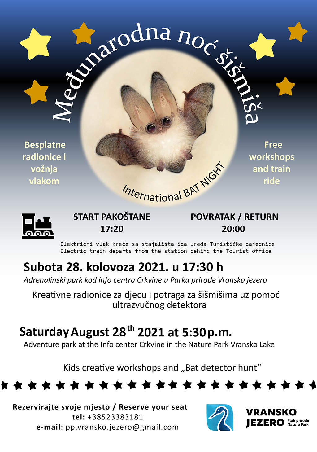 S obzirom da je broj sudionika na radionici ograničen, kao i kapacitet mjesta u električnom vlaku, poželjna je prethodna najava na broj telefona Ustanove Parka prirode Vransko jezero: +38523383181 uz rok prijave do petka, 27.08.2021. godine do 14 h ili na e-mail: pp.vransko.jezero@gmail.com do subote, 28.08.2021. godine do 10h. Prijave se primaju do popunjenja mjesta!
