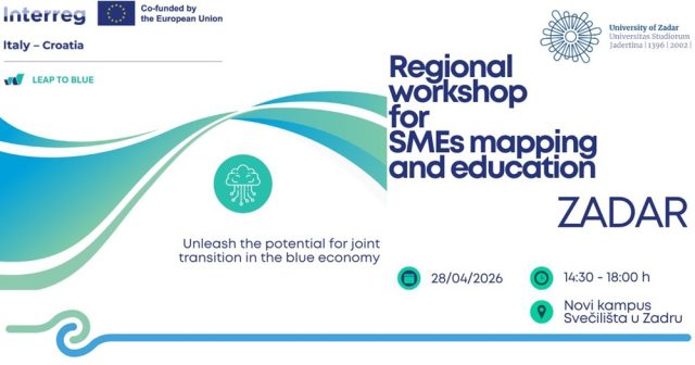 Sveučilište u Zadru poziva sve zainteresirane na regionalnu radionicu strateškog projekta LEAP TO BLUE (Interreg Italija-Hrvatska). Radionica će se održati u utorak, 28. travnja 2026., s početkom u 14:30 sati na Novom kampusu Sveučilišta u Zadru (Dvorana 117), a glavni cilj projekta je pružanje izravne podrške malim i srednjim poduzetnicima u njihovoj digitalnoj i zelenoj tranziciji.