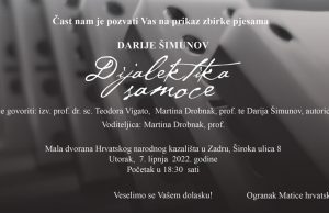 Ogranak Matice hrvatske u Zadru prikazuje zbirku poezije Darije Šimunov: Dijalektika samoće. O knjizi će govoriti recenzentice: Martina Drobnak, prof i izv. prof. dr....