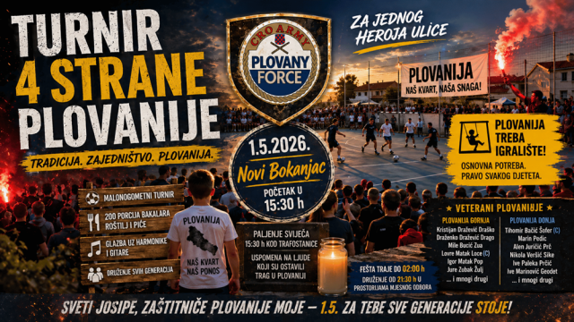 Turnir 4 strane Plovanije 2026 ponovno potvrđuje da Plovanija nije samo mjesto stanovanja, već kvart u kojem zajedništvo ima stvarno značenje. Tradicionalni malonogometni turnir održava se 1. svibnja 2026. na Novom Bokanjcu i još jednom okuplja sve generacije – od djece do starijih mještana. Iako je sport u središtu događaja, turnir nosi i jasnu poruku mjesnog odbora: Plovaniji nedostaje osnovna infrastruktura, prije svega igralište. Upravo zato ovaj događaj ima važnost koja nadilazi teren i rezultat.