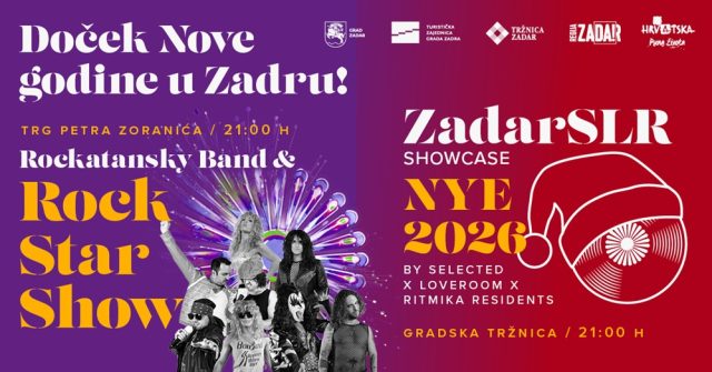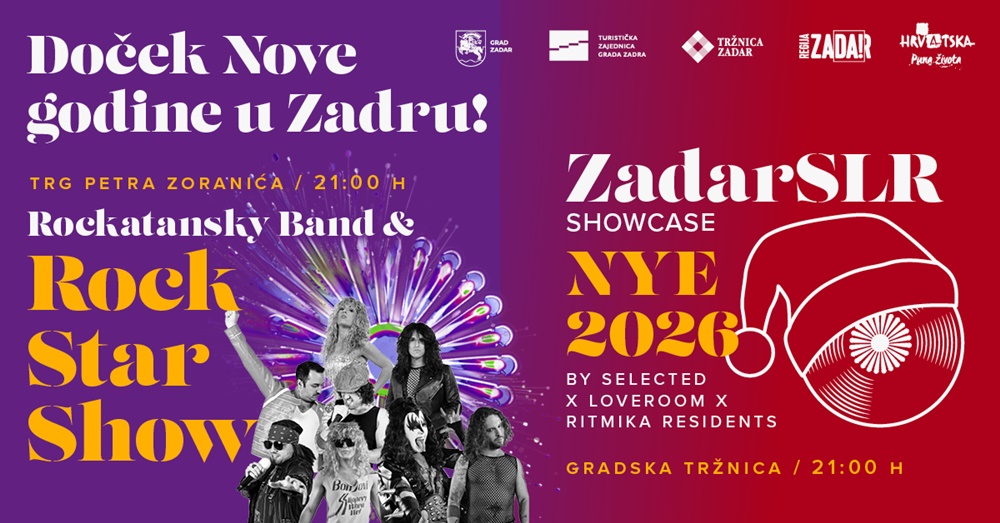 Najluđa noć na zadarskoj pijaci krenut će od 21 sat pod svjetlima lasera uz hipnotički electro beat najboljih zadarskih elektronskih kolektiva, dok će Silvestrovo na Trgu Petra Zoranića od 21 sat započeti sa starim zadarskim znalcima i glazbenim virtuozima Rockatansky Bandom. Od 23 sata slušat ćemo pak i gledati najvjernije izvedbe The Queen, Kiss, Tine Turner, Bon Jovi, Europe, Ozzy Osbourna, AC/DC, Guns N’ Roses i drugih rock velikana iz 1980-ih i 1990-ih. Vjerne pjevačke, kostimografske i scenske inačice najpopularnijih bendova i pjevača zovu se The Rockstar Show. Riječ je o talijanskoj supergrupi i eventu koji diljem Italije i Europe izvode glazbenici nadahnuti najvećim imenima svjetskog rocka. Zadar je njihova novogodišnja destinacija.