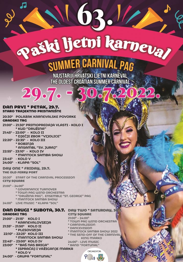 Turistička zajednica Grada Paga i Grad Pag pozivaju ljubitelje maškaranog ludovanja na 63. Paški ljetni karneval koji će se održati u petak, 29. i subotu, 30. srpnja 2022. godine.