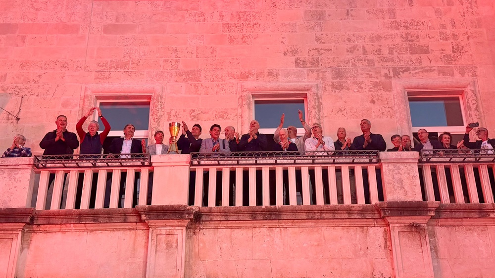 Vrhunac večeri dogodio se na balkonu gradske uprave, istom onom na kojem je prije 40 godina slavljen povijesni uspjeh. Gotovo cijela momčad popela se na balkon i podigla pehar, ponovivši trenutak koji je ušao u povijest. Posebno iznenađenje bilo je otkriće da je riječ o originalnom peharu, što ni sami igrači nisu znali do samog trenutka, budući da se u klupskim prostorijama čuva replika.
