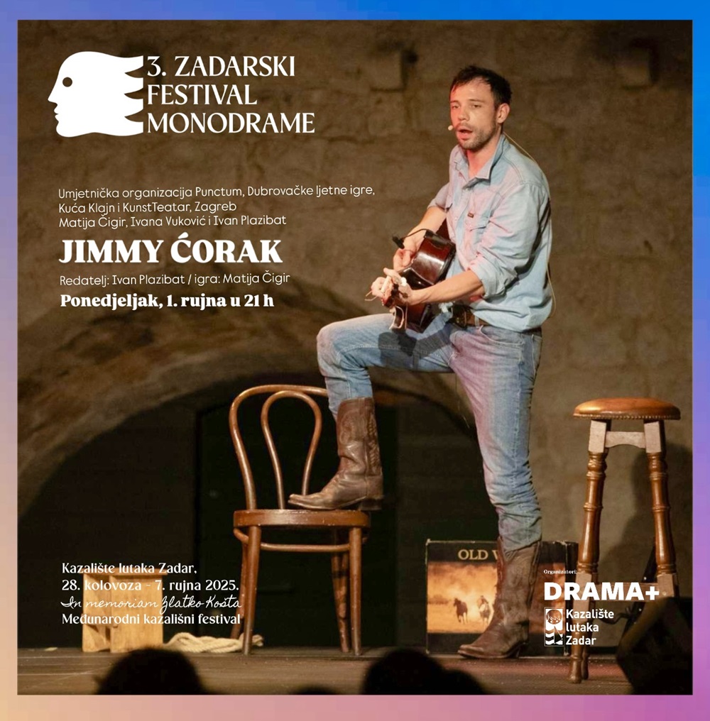 Nakon jučerašnjih dviju izuzetno zanimljivih monodrama “Jama” i “Maske” u briljantnim izvedbama glumaca Andrije Nazlića i Dražena Šivaka, večeras na 3. Zadarskom festivalu monodrame pogledajte predstavu “Jimmy Ćorak” autora Ivane Vuković, Ivana Plazibata i Matije Čigira u režiji Ivana Plazibata i izvedbi Matije Čigira te produkciji UO Punctum, Dubrovačkih ljetnih igrara, Kuće Klajn i KunstTeatra iz Zagreba.